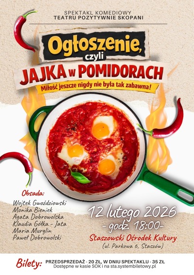 Spektakl komediowy "Ogłoszenie, czyli jajka w pomidorach" Teatr "Pozytywnie Skopani" zaprasza na komediową karuzelę pomyłek, nieporozumień i uczuć, które absolutnie nie trzymają się scenariusza. Już 12 lutego scena Staszowskiego Ośrodka Kultury zmieni się w miejsce, gdzie rozsądek bierze wolne, a jedno niewinne "ogłoszenie" wywołuje prawdziwy efekt domina.